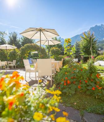ampio giardino con vista mozzafiato sulle Dolomiti ascoltando i suoni della natura.